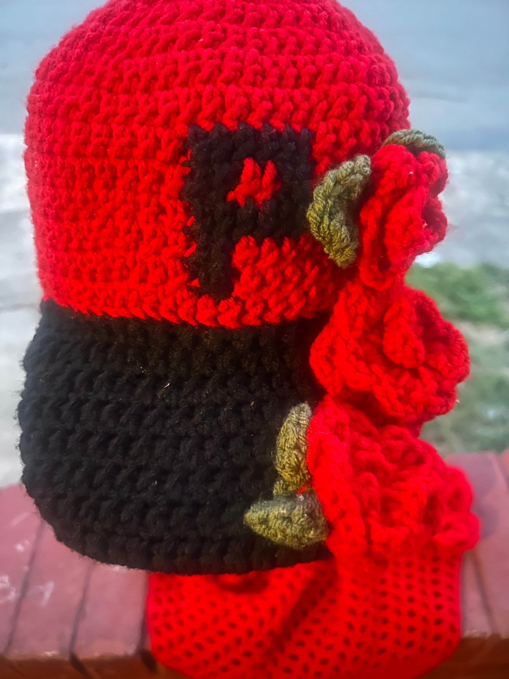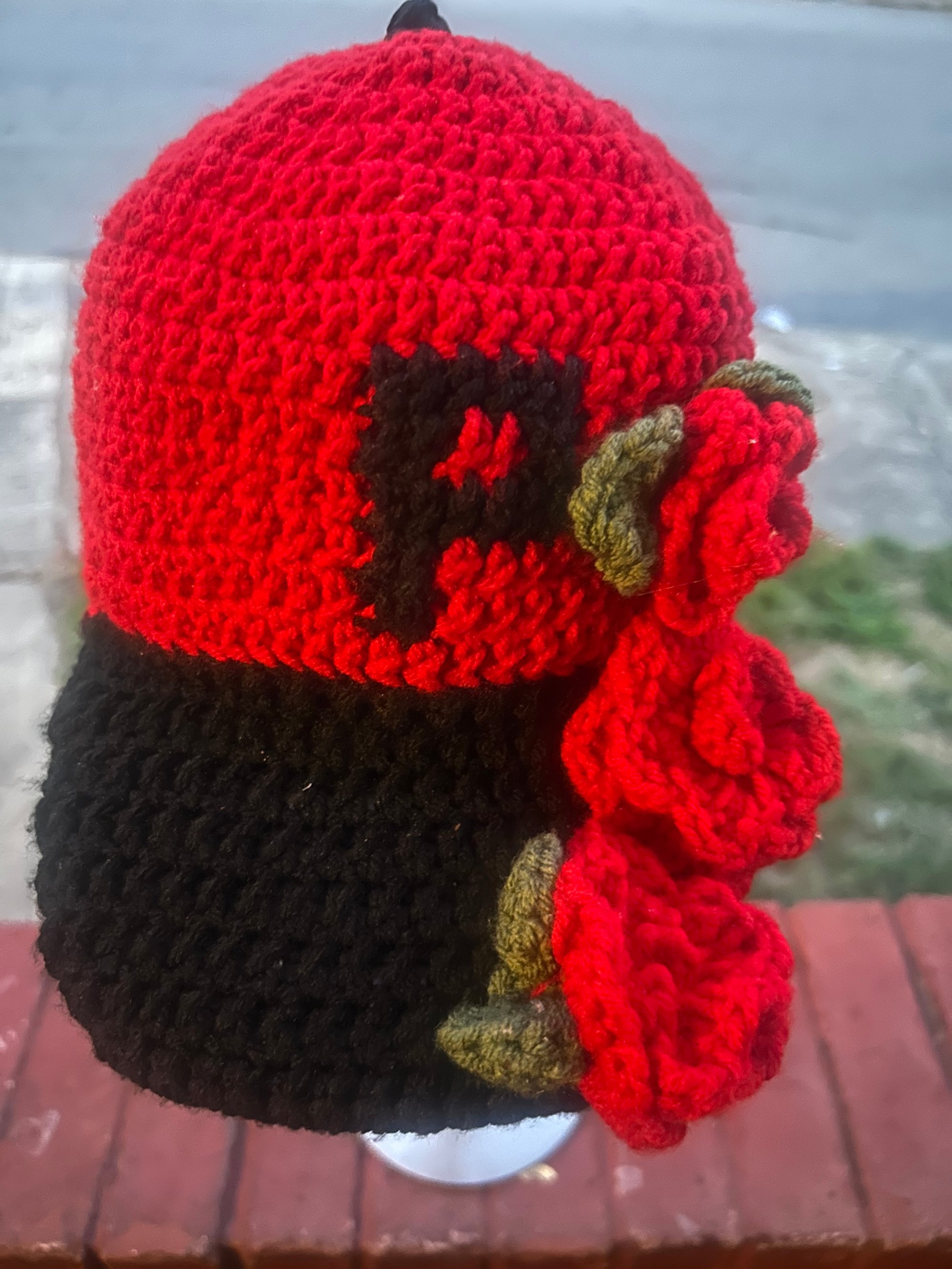 Make a statement with our “Roses Are Red” crochet baseball cap, handcrafted in striking red and black yarn. Featuring 3D crocheted roses adorning the crown and a detachable cape for an edgy, versatile look, this piece blends street style with bold, artistic flair. Perfect for festivals, fashion-forward outings, or anytime you want to stand out, it’s a unique accessory that turns heads wherever you go.