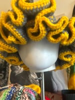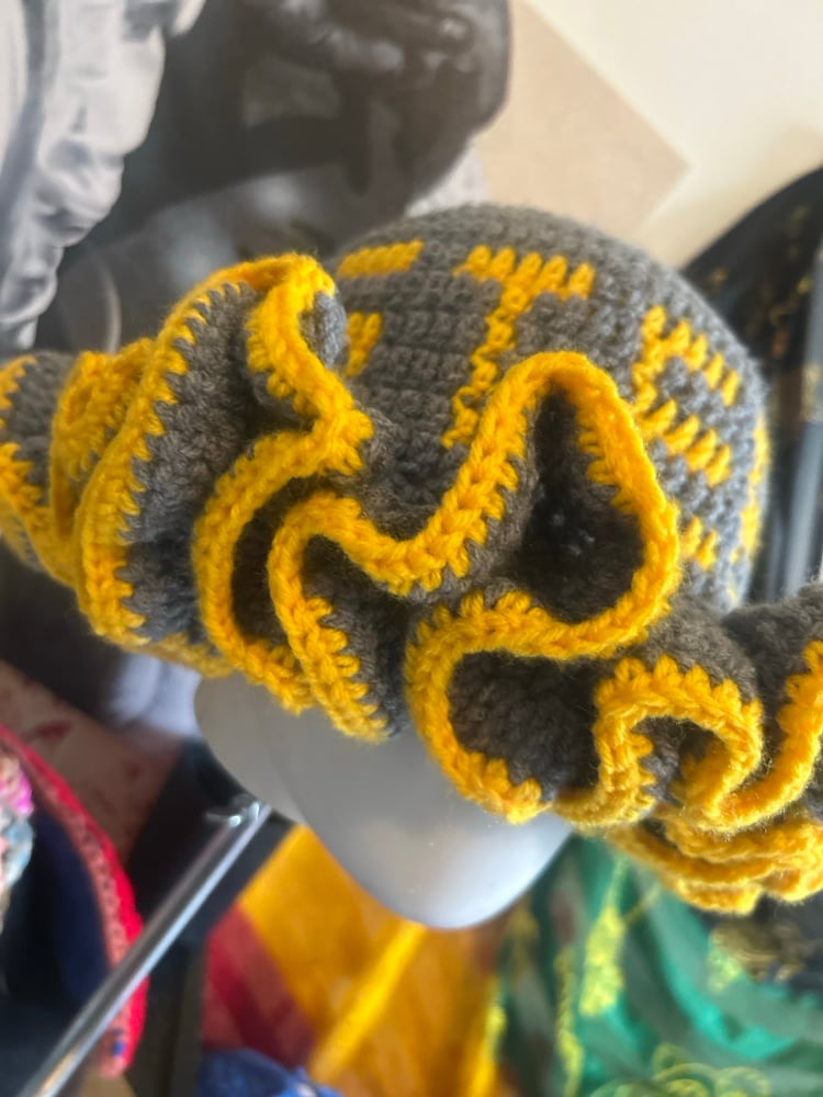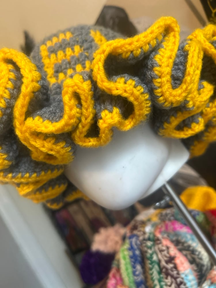 Show off your Steelers pride in style with this handmade gray and yellow ruffle crochet hat. Designed with bold, layered ruffles and classic Steelers-inspired colors, this hat is the perfect mix of sporty and fashion-forward. The soft yarn and flexible fit make it comfortable for all-day wear, whether you’re headed to the game, a tailgate, or just repping your team around town.