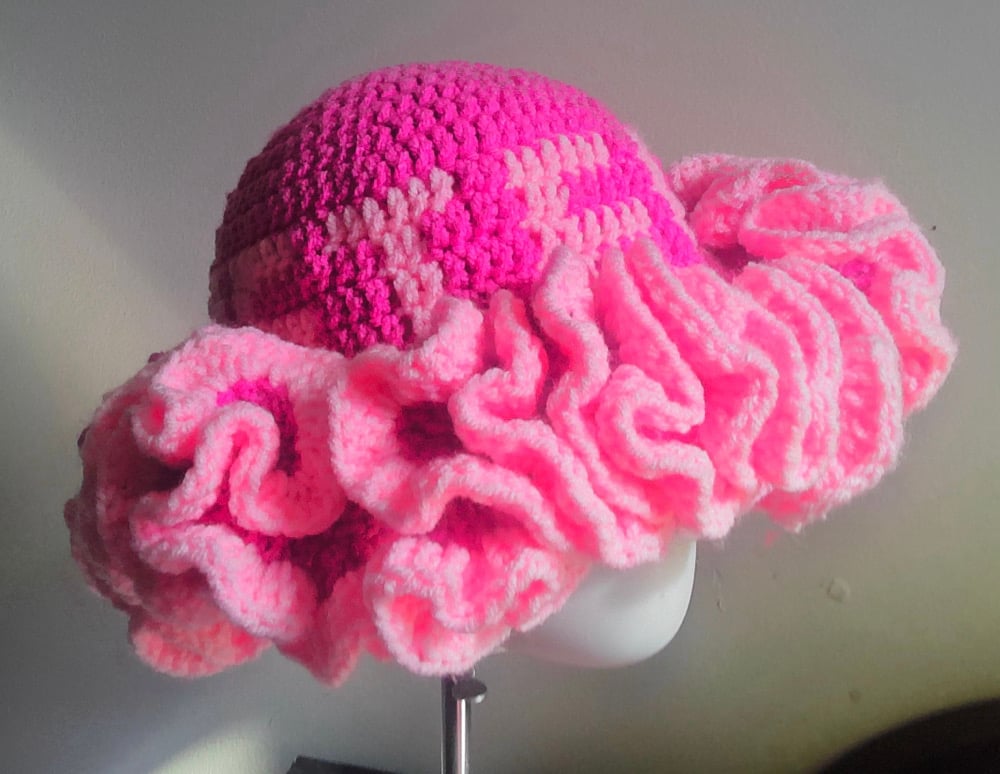 Show your team pride and support a powerful cause with this hand-crocheted ruffle hat. Designed in shades of bold pink and soft light pink, this unique Steelers-inspired piece honors Breast Cancer Awareness while keeping game-day style strong. The ruffled brim adds playful volume and comfort, while the color palette makes a statement of strength, hope, and unity. Perfect for October games, tailgates, or everyday wear, this hat blends Steelers spirit with meaningful awareness in a one-of-a-kind accessory.
